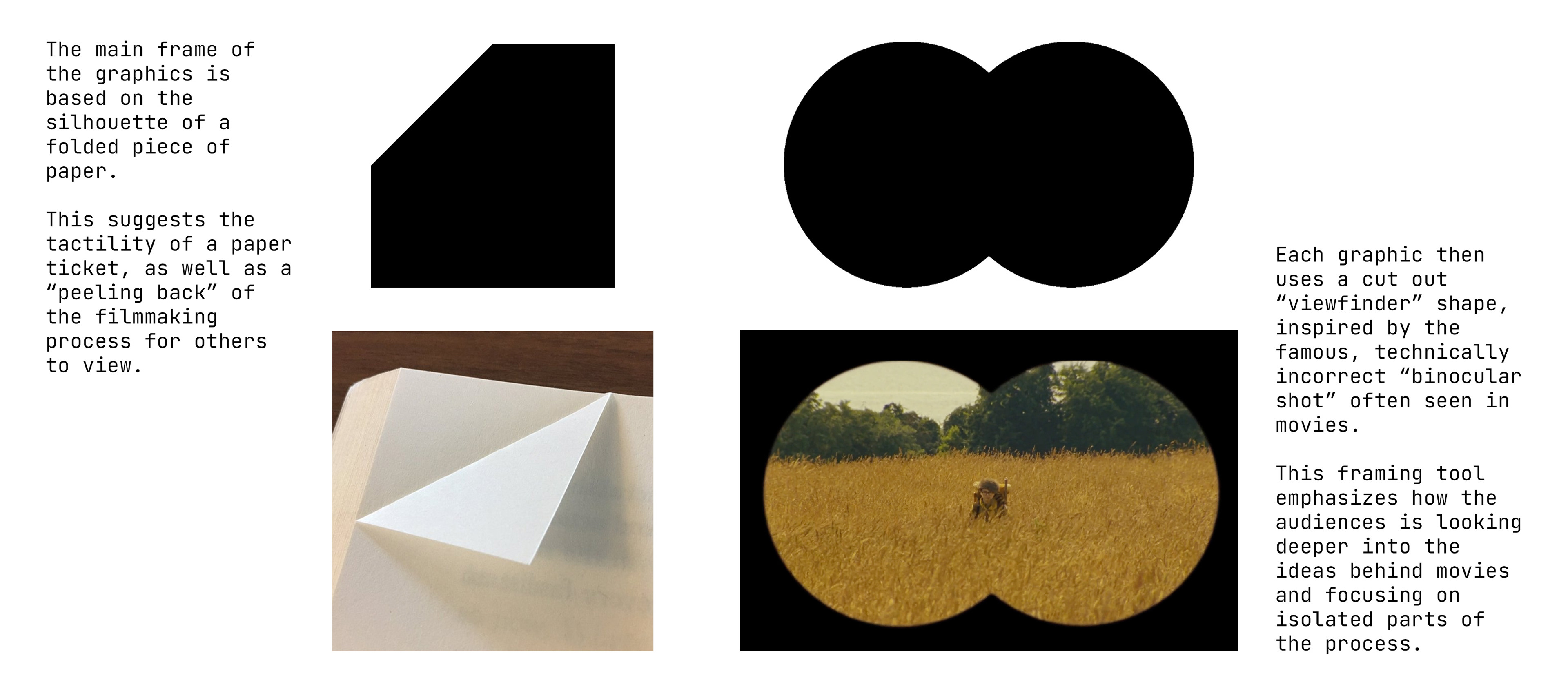 Starting in the Fall, weekly meetings with our team outlined our identity for the season. We were inspired by the translucent nature of thin paper and perforated edges of movie tickets as visual motifs to draw from. This inspiration continued into our typefaces as we chose a mono spaced font that looked like something you would see on a ticket stub. Bold, condensed serif text became our main typeface choice and continued to point to a retro look that we could play with to appear timeless.