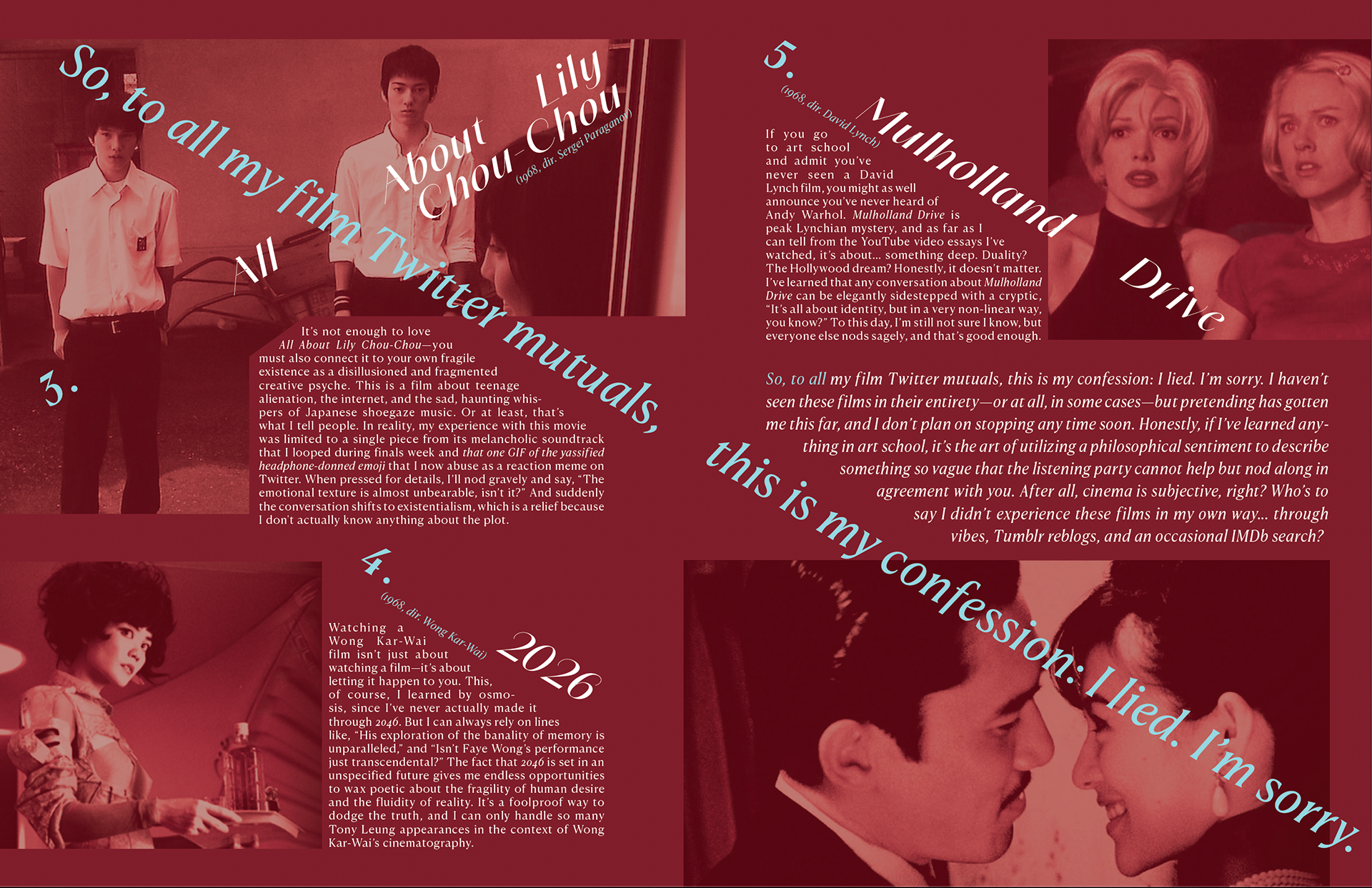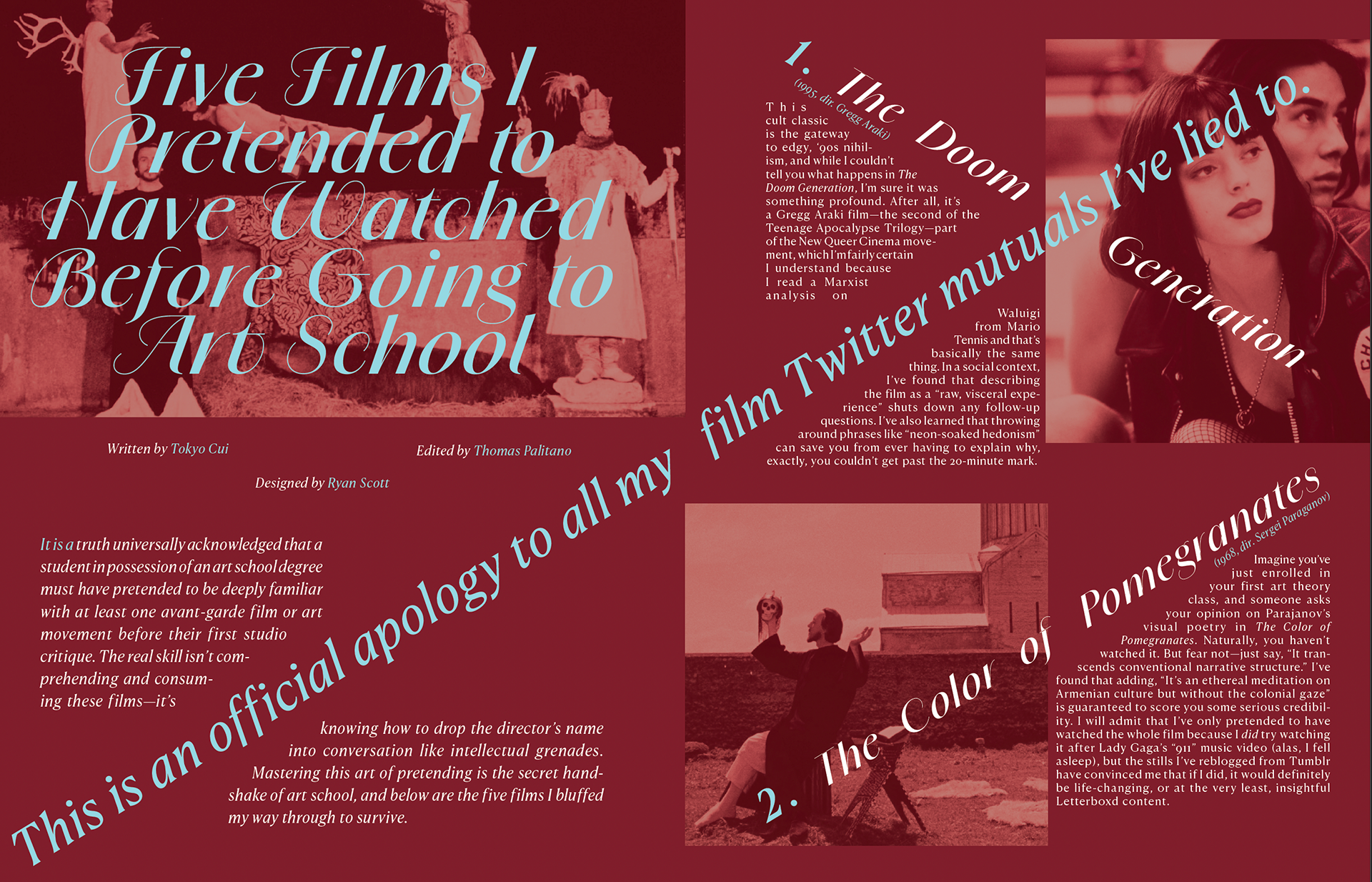 Brown Film Magazine—Brown University’s preeminent space for film and television enthusiasts to see their writing in print. Driven by a massive team of talented staff writers, editors, designers, and illustrators, BFM maintains a regular presence online where you can find film reviews, interviews with industry members, argumentative articles, analyses, comedy pieces, and more.