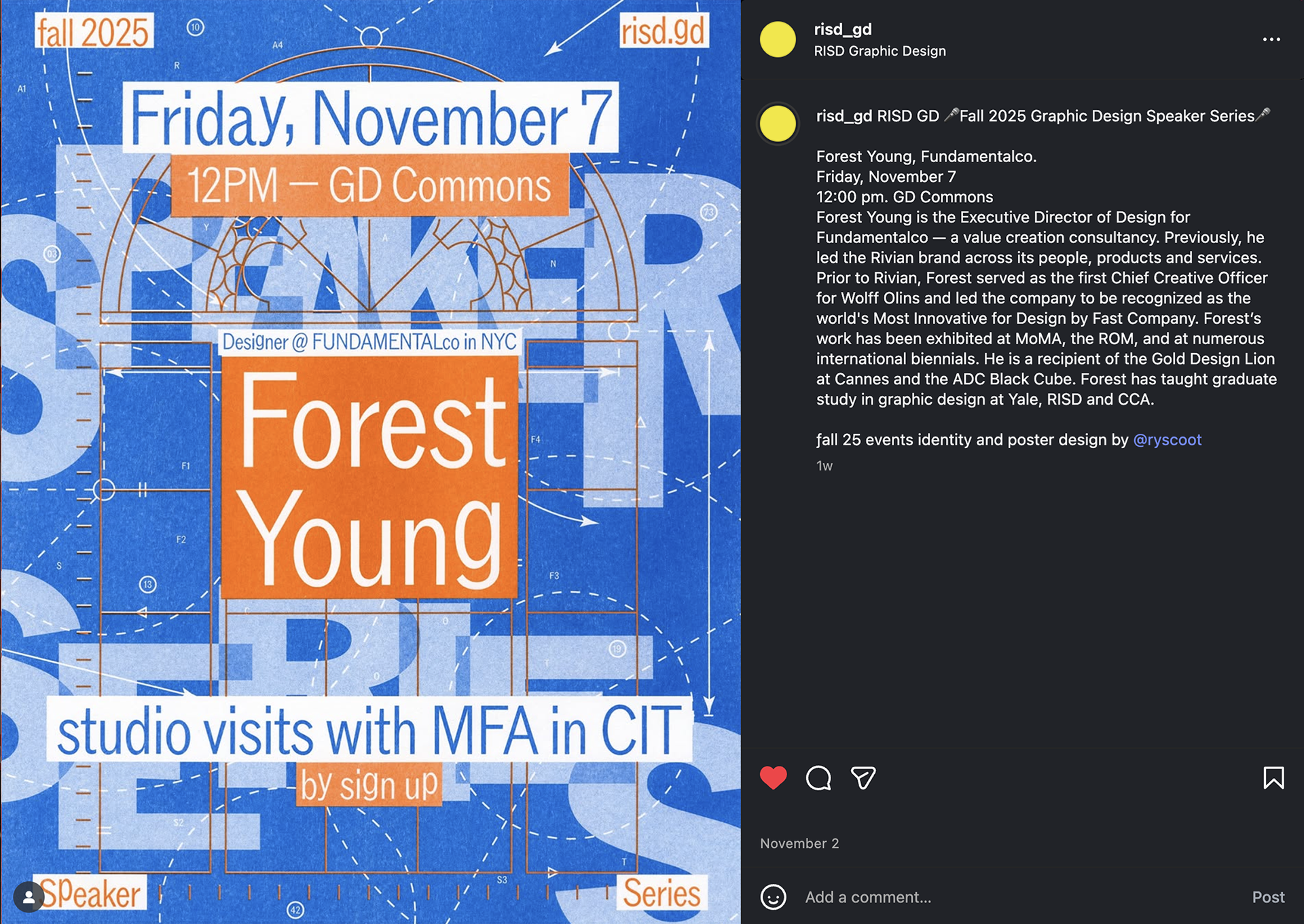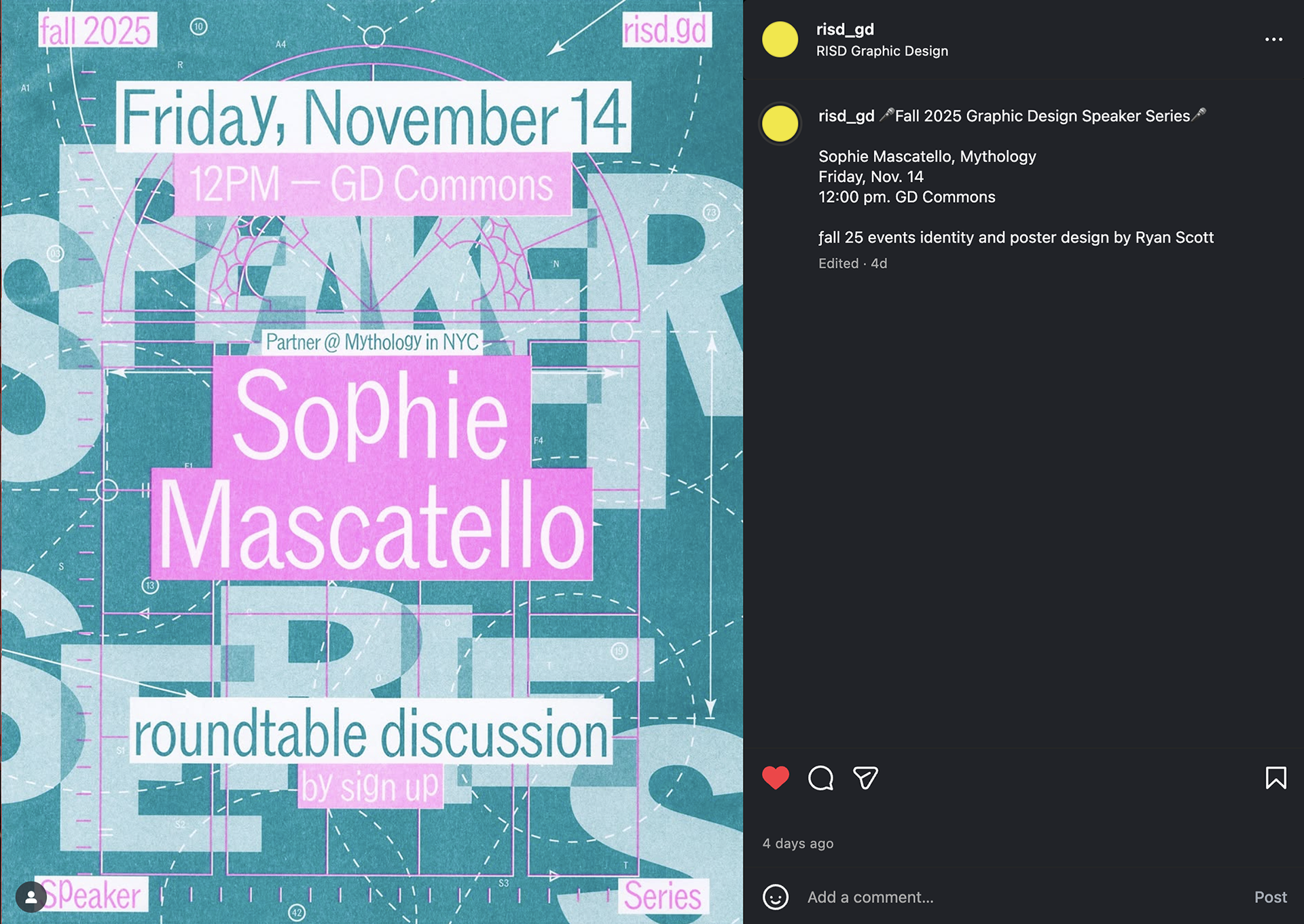 Software workshops, advising days, and pop up shows were also advertised. The project culminated in the posters being hung around the first floor of RISD's Design Center building, a post on the official RISD GD Instagram, and custom four-page zines advertising the events handed out to new and returning students during welcome back events.