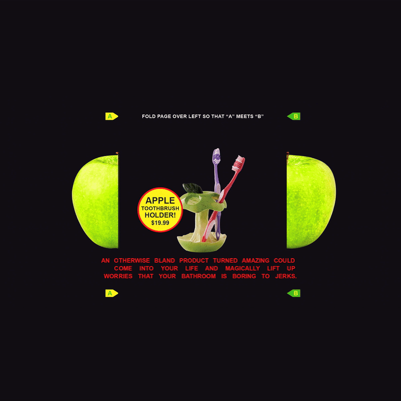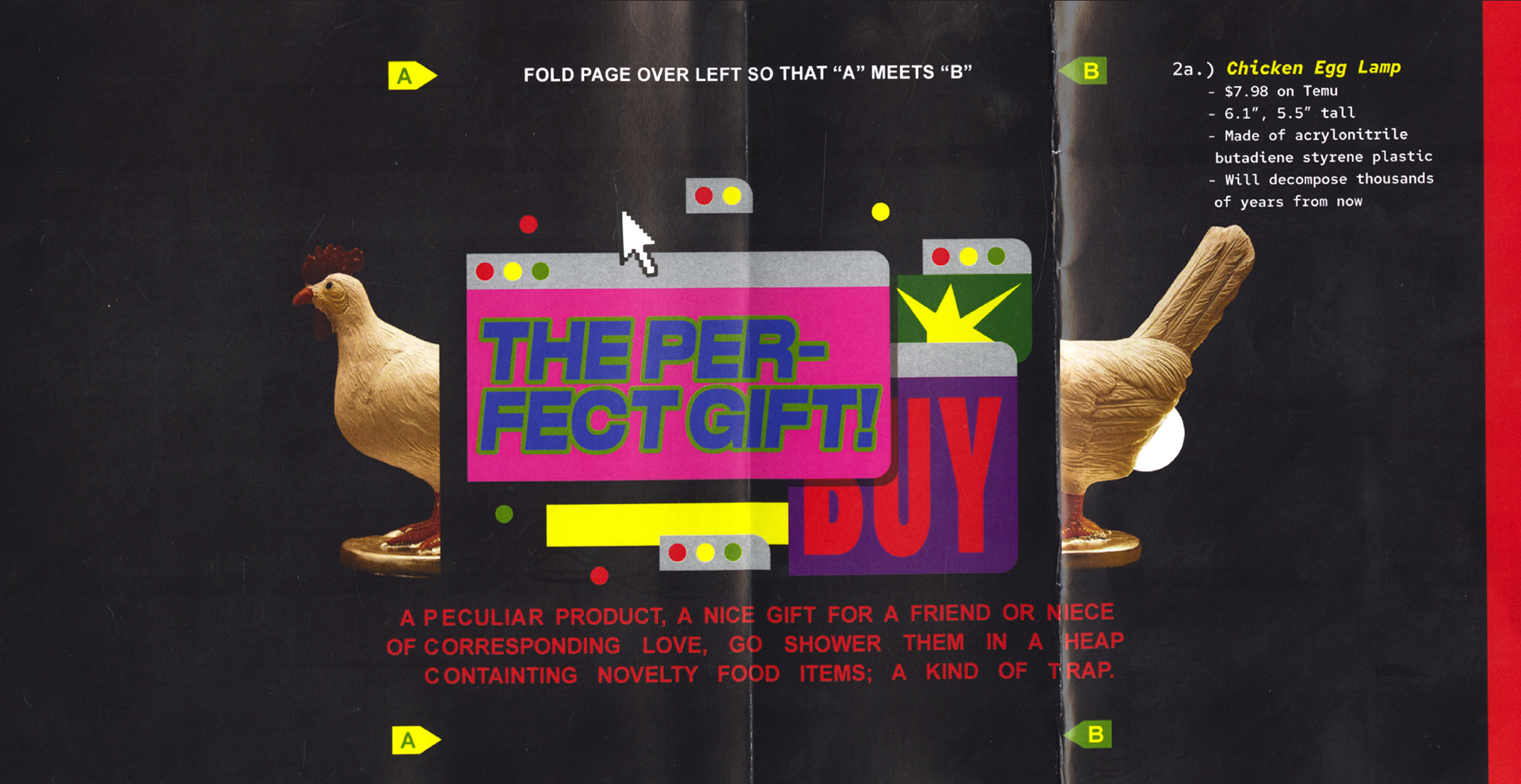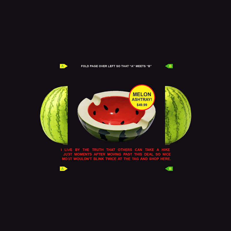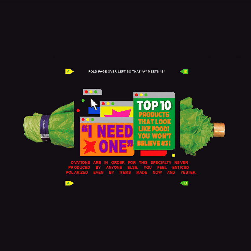 Inspired by the work of legendary American cartoonist Al Jaffe (1921–2023), known for his MAD Fold-ins, MAD CONSUMPTION is a tribute to the folded setup and punchline for a new generation of idiots.